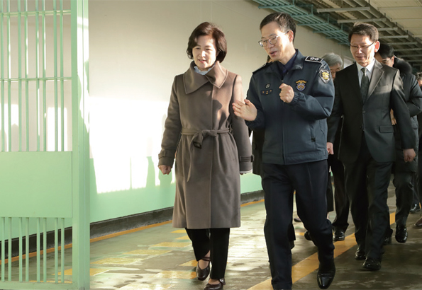 추미애 법무부장관과 최강주 교정본부장은 지난 1월 23일 서울구치소 정책현장을 방문하였다. 이번 방문에서 추미애 법무부장관은 주요업무 현황을 청취하였고 교정시설을 순시하며 수용자 합동차례 등 설맞이 교화행사를 확인하였다. 또한 명절에도 고향에 내려가지 못하고 수용관리에 전념하고 있는 현장 직원들을 격려하였다.
