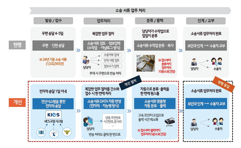 그러나 전자적 송달 체계로 전환되면, 소송서류의 접수부터 폐기까지 통합 관리가 가능해진다. 전자소송서류에 담긴 성명 등의 주요 데이터를 이용해 수신된 문서는 해당 수용자에게 편철되고, KICS를 활용해 수용자별·수용동별 서류 분류가 가능해진다. 또한 서류 처리 건수가 많은 기관에는 고속프린터가 우선적으로 도입되어 서류 출력에 걸리는 시간 부담도 줄어들 전망이다.